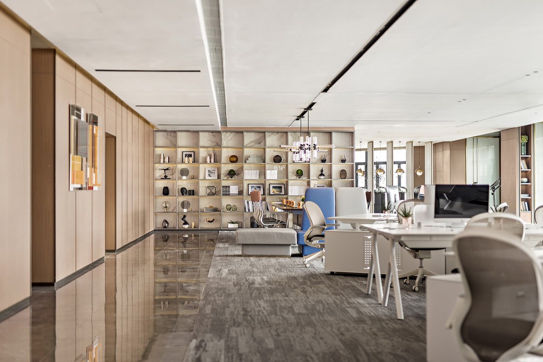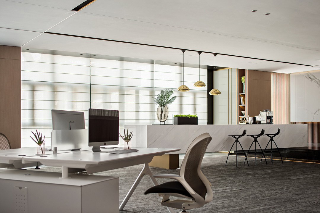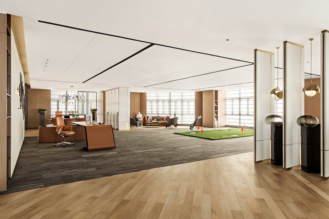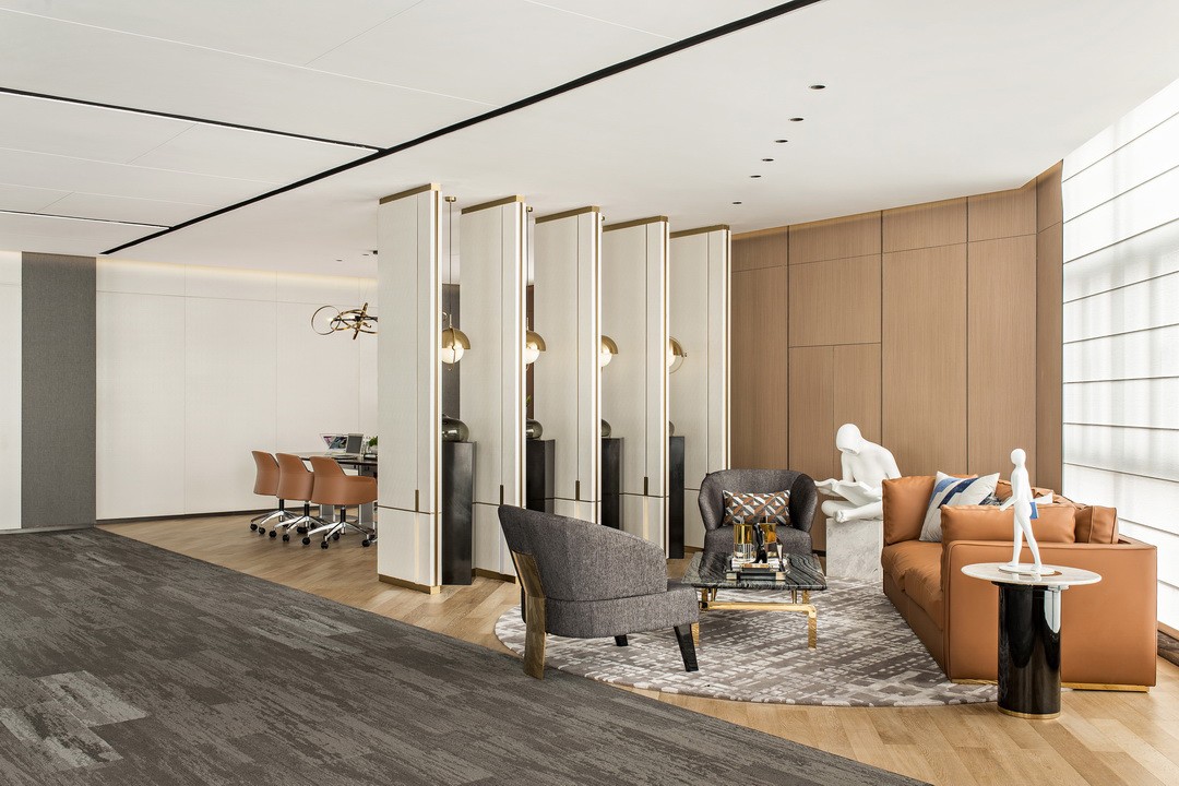 The internal office area pays more attention to comfort and efficiency than the outdoor hall. The carpet has the function of silencer. The use of glass and wooden lampposts enhances the atmosphere and life. The entire space is laid on the basis of not affecting the vision outside the window. Open, so that business operations are efficient, cultural connotation, and wealth value can complement each other.