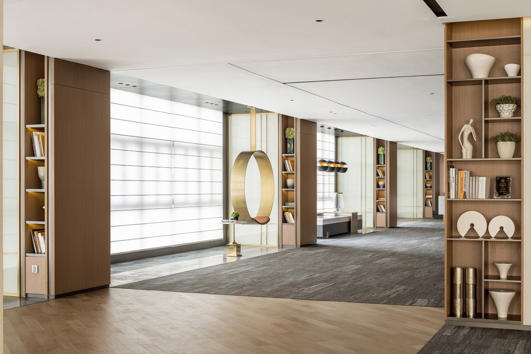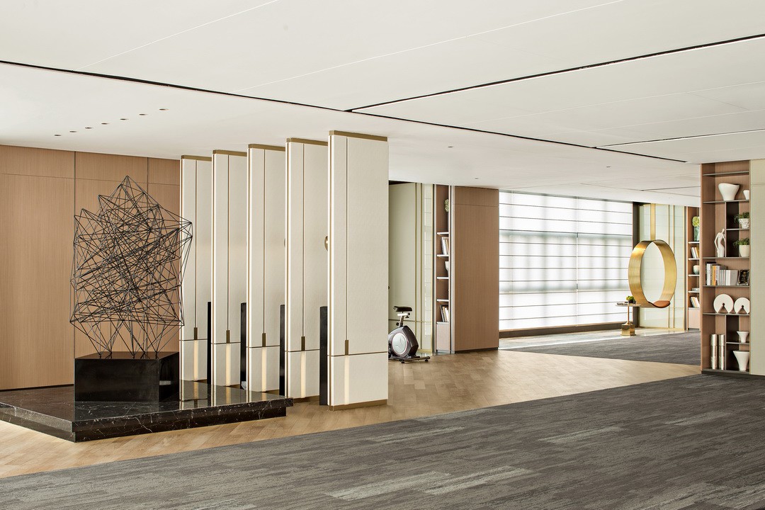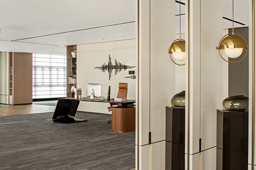 空間運(yùn)用厚重深沉的大理石貫穿公共辦公外部區(qū)域,在自然光的折射下,猶如一潭平靜的湖水,金屬格柵式的墻面,傳遞出辦公樓的莊嚴(yán)與寧靜,在燈飾及軟裝的選擇上,著重極簡與光屬感,樓宇直入云霄,保留落地窗外的鳥瞰之景,賓客可佇立于此,眺望方圓。