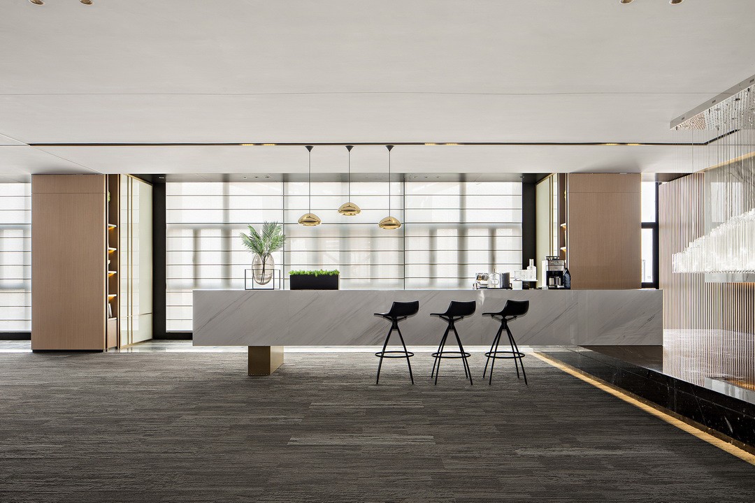 The space uses heavy and deep marble to penetrate the external areas of the public office. Under the refraction of natural light, it is like a calm lake. The metal grid-like wall conveys the solemnity and tranquility of the office building. In the choice of lighting and soft decoration , Focusing on minimalism and a sense of light ownership, the building is straight into the sky, retaining the bird's-eye view from the floor-to-ceiling windows, and guests can stand here and look at the surrounding area.