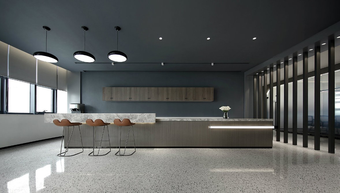 會(huì)議室和水吧是空間的核心筒,由此形成一個(gè)環(huán)形的動(dòng)線??腿伺c員工進(jìn)入公司分別有不同的路徑,員工通過(guò)刷卡可以從側(cè)面入口更有效的進(jìn)入辦公區(qū)域。來(lái)訪的客人則需要環(huán)繞會(huì)議室外圍一圈進(jìn)入公司區(qū)域,這樣的設(shè)計(jì),能讓客人沿途參觀到公司項(xiàng)目和部分工藝與材料的展示,讓到訪者更好地了解公司的各方面業(yè)務(wù)能力??臻g最深處是最重要的辦公區(qū)域。一側(cè)靠窗,另一側(cè)我們規(guī)劃為洽談室,在這里可以更方便的做小型的會(huì)議交流。對(duì)于辦公室的空間規(guī)劃,我們讓員工與領(lǐng)導(dǎo)的辦公空間有一定的間距與分隔,這樣可以讓各自更放松的投入到工作中。