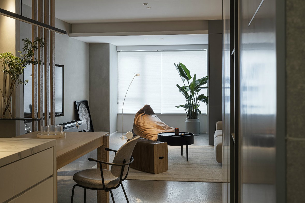 The overall tone is mainly gray, the unique visual sense of the color gives the space a calm and slightly calm temperament, the geometrical lighting is exquisite and atmospheric, and the sofas, tables and chairs are full of lines, which not only enhances the artistic sense of the living room, but also The space brings richer level changes. The dark walls and light-colored carpets use lines to outline the space, with clear levels, simple and prosperous, low-key and restrained. Artworks are neatly arranged on wooden shelves, and frequently read books can also be stored here.