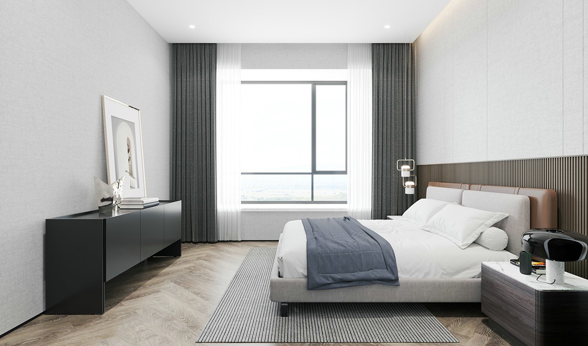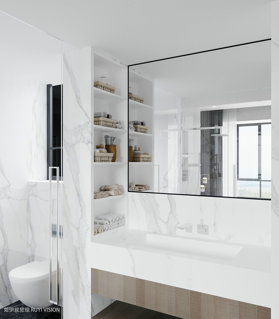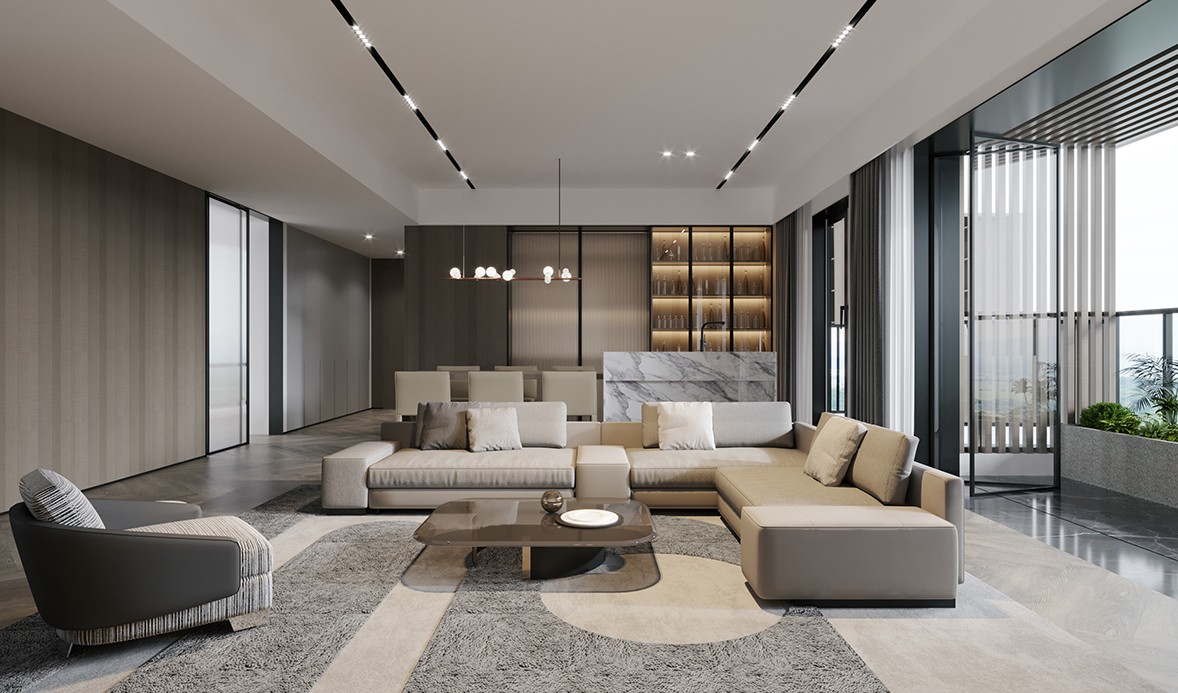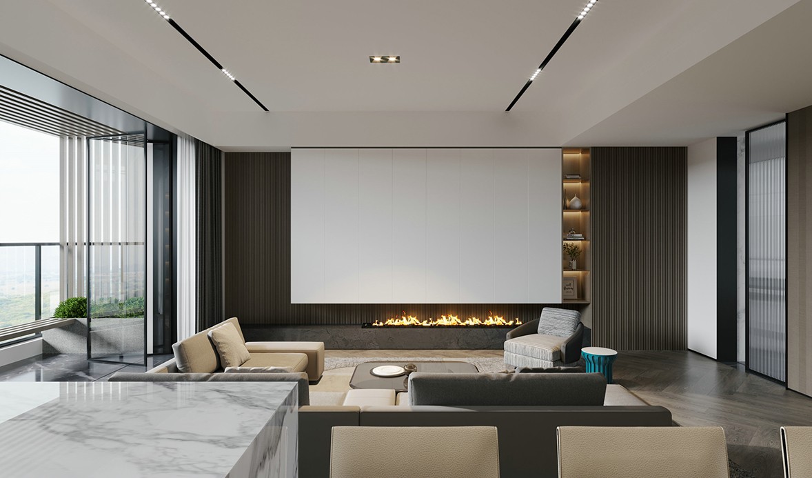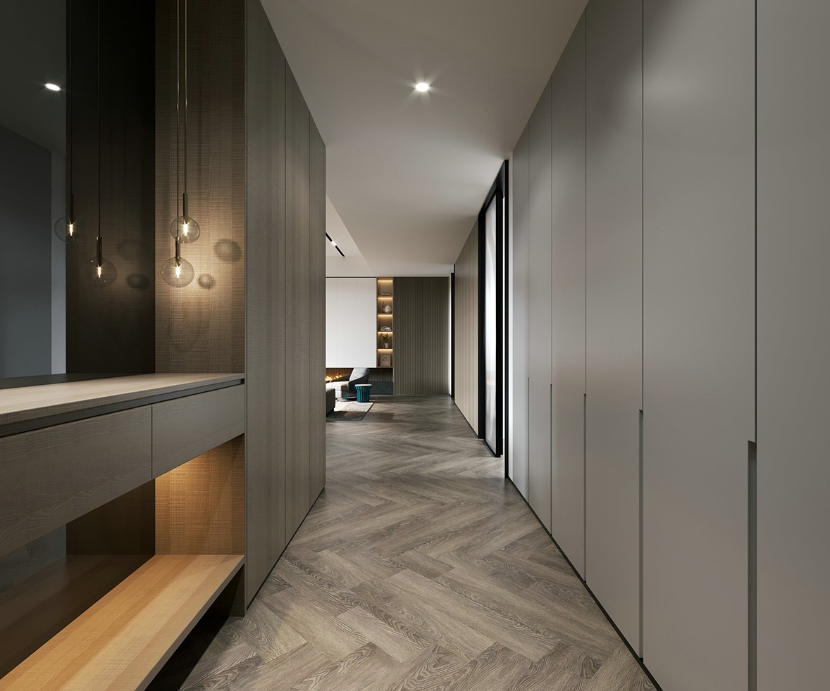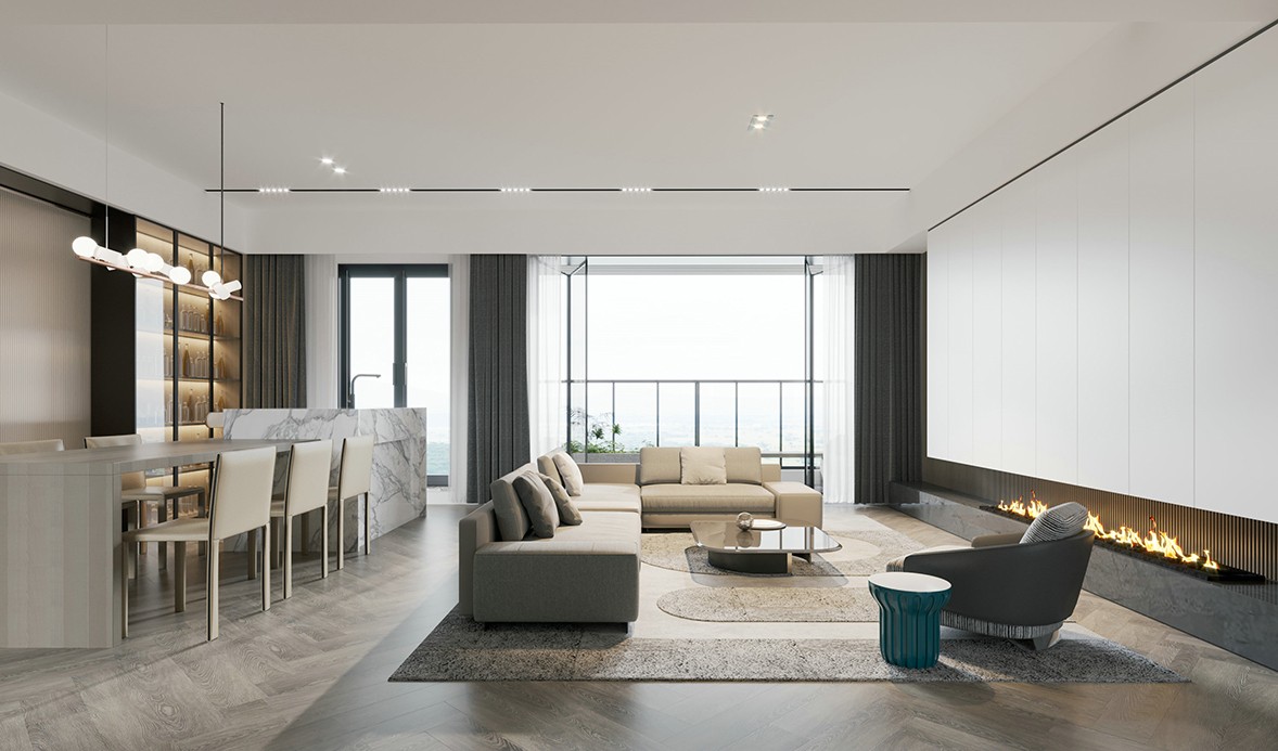The design uses natural materials, the softest colors and the most authentic textures to express the simplest life. The chic linear chandelier creates a comfortable and elegant dining environment. The warm and rustic natural oak veneer complements the matte paint with its own cool breath, and is complemented by invisible light strips to enhance the atmosphere, outline the outline, and instantly enhance the hierarchy of the space. The dining room is designed on the side of the living room to make a whole guest dining room. The simplicity and purity of the restaurant area is just like the temperament of the owner himself. Pure space makes people feel peaceful and relaxed, remove impetuosity, and return to the essence of life.