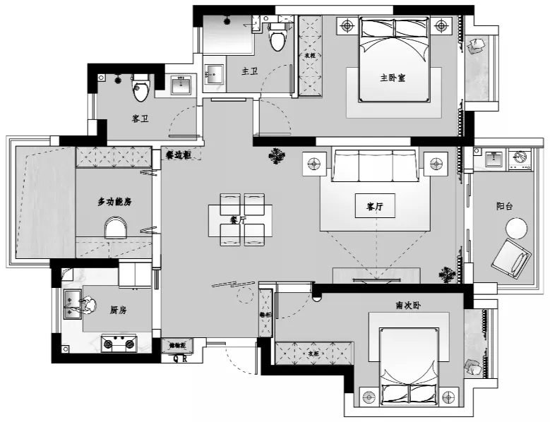 “解”的方式打破了原有昏暗的中軸空間,讓陽光照射到每個角落?!皹?gòu)”的方式在材質(zhì)上選擇鑒于“解”與“構(gòu)”兩者之間,選用了玻璃材質(zhì)。材料上利用玻璃、鋼板、木材、亞克力材質(zhì)的不同厚度體量和不同材質(zhì)的質(zhì)地對比反差,給空間層次一種“干凈”、“細膩”的節(jié)奏感。嘗試著在保留原有空間結(jié)構(gòu)方向的同時,找出新的軸線關(guān)系,運用軸線平移的方式使空間功能得到滿足。打破原有中軸空間,運用軸線平移方式滿足空間功能
