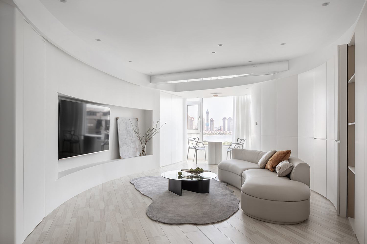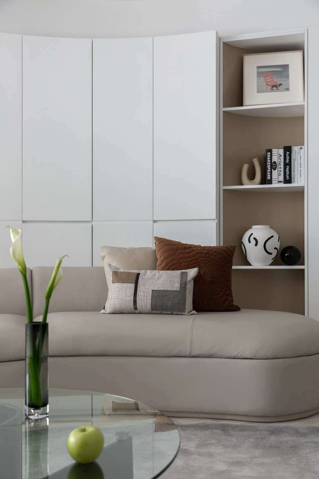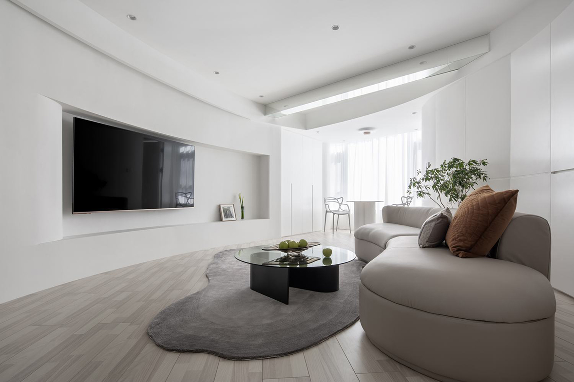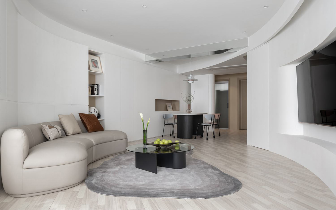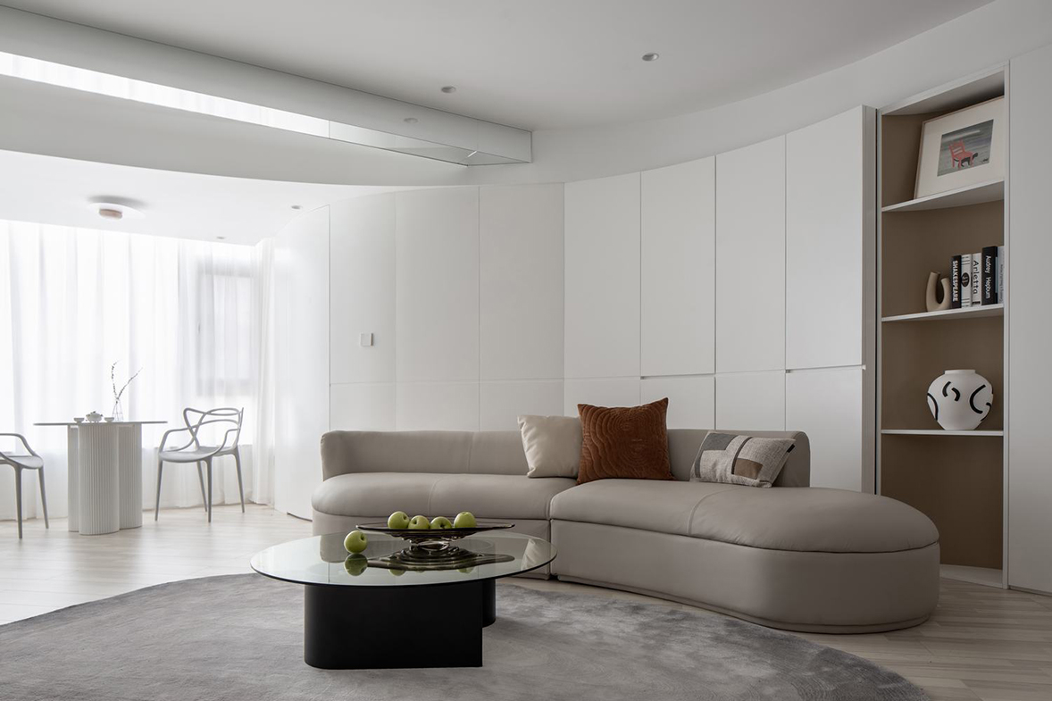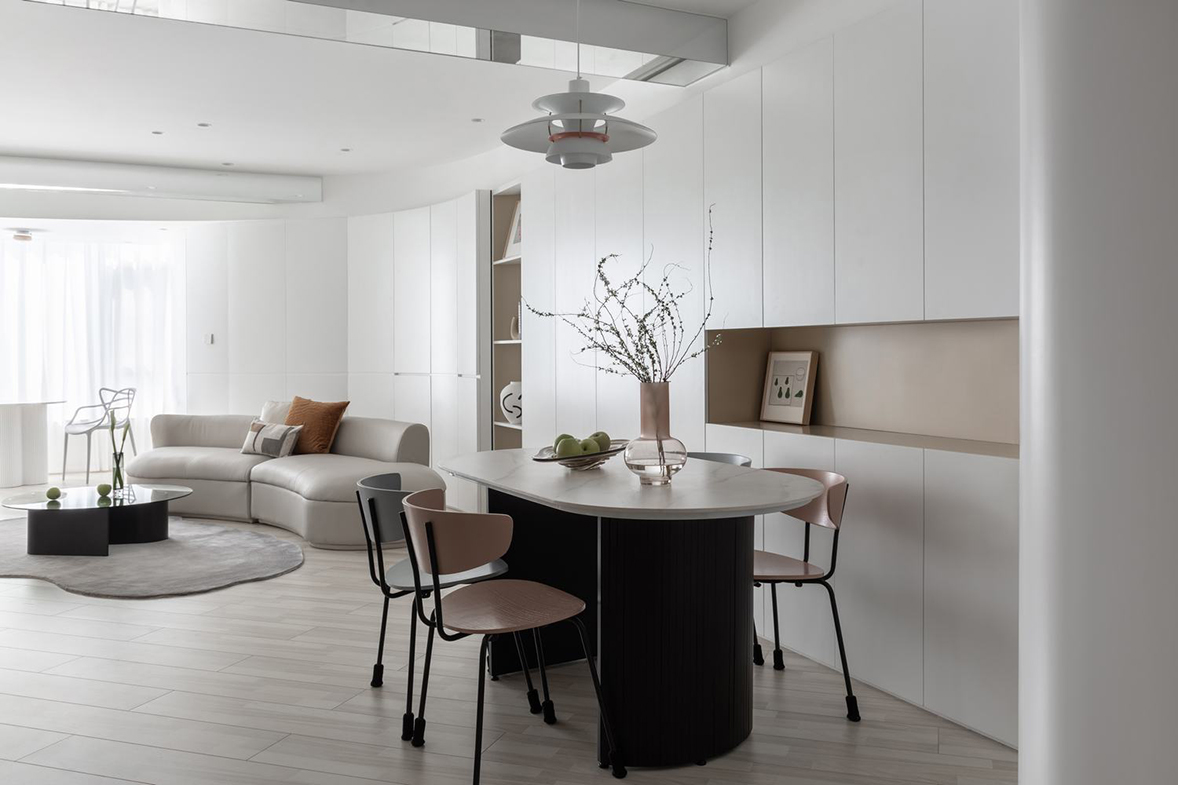 以白色的墻面為基底搭配大量的木質(zhì)加之利落的金屬元素,木材溫潤的色澤給空間帶來質(zhì)樸的舒適感。細(xì)膩的光線透過通透的玻璃與清幽的綠植,溫潤了空間的觸感,賦予空間自然純粹的氣質(zhì),營造一個(gè)陽光滿屋的生活空間優(yōu)雅柔軟的白色毛毯自然隨性的搭在充滿歷史感的復(fù)古皮質(zhì)沙發(fā)上,加之實(shí)木茶幾、原木色單椅、精致的藝術(shù)裝置品及燈具為空間提高藝術(shù)質(zhì)感的同時(shí),愜意的居家氣息撲面而來,溫暖而獨(dú)特。生活藝術(shù)化,是人生美好的狀態(tài),也是人類不息追求的至鏡。