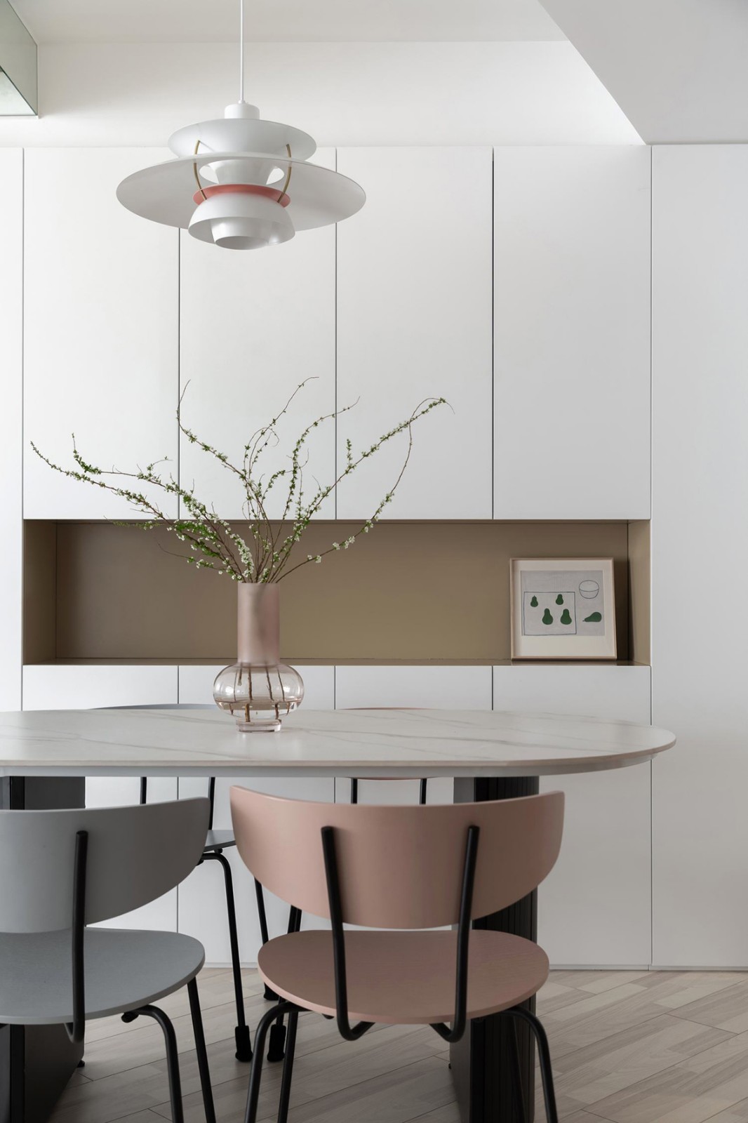 With a white wall as the base, a large amount of wood and neat metal elements, the warm color of the wood brings a simple and comfortable feeling to the space. The delicate light penetrates the transparent glass and the quiet green plants, moisturizing the touch of the space, giving the space a natural and pure temperament, creating a living space full of sunshine. The elegant and soft white blankets are naturally laid on with a sense of history. On the old retro leather sofa, combined with solid wood coffee table, original wood color single chair, exquisite art installations and lamps, while enhancing the artistic texture of the space, the cozy home atmosphere blows into the face, warm and unique. The art of life is a beautiful state of life, and it is also the perfect mirror for human beings' endless pursuit.