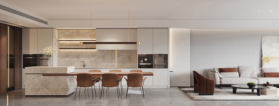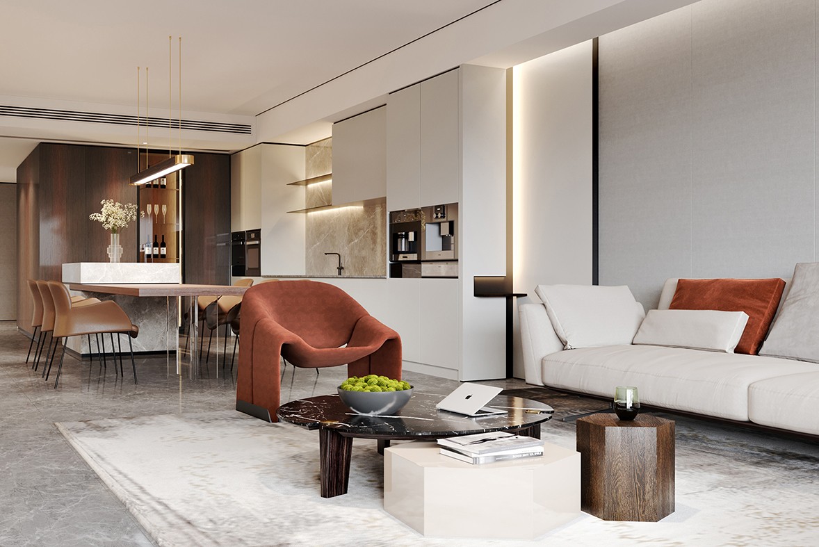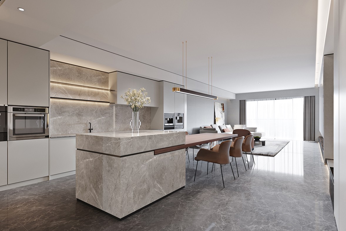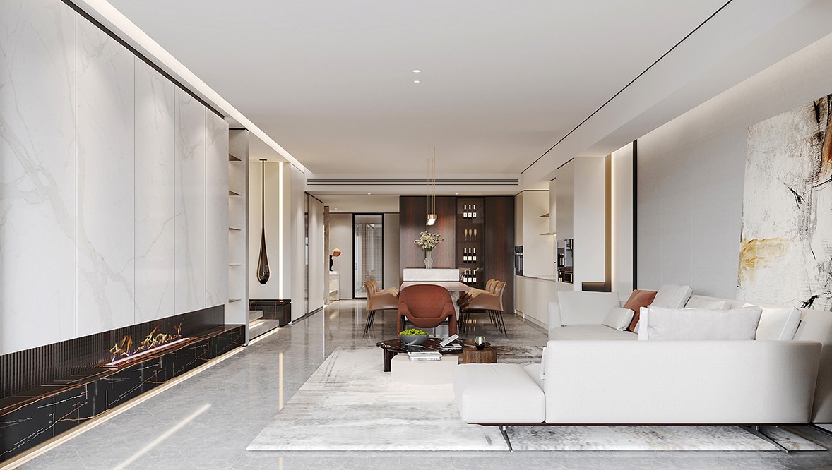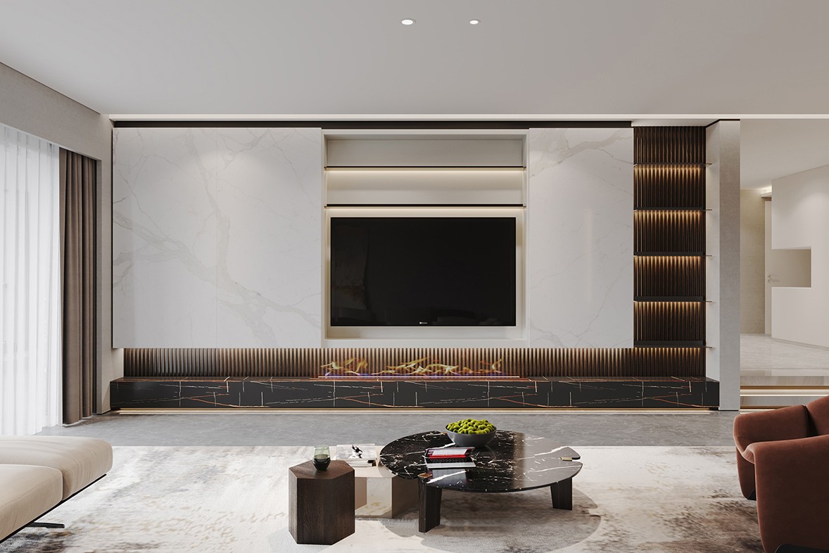The texture of the marble TV wall is simple and textured, and the brass mirror underneath increases the ductility of the space. The living room and bedroom space are mutually infiltrated, which increases the utilization rate of the space.