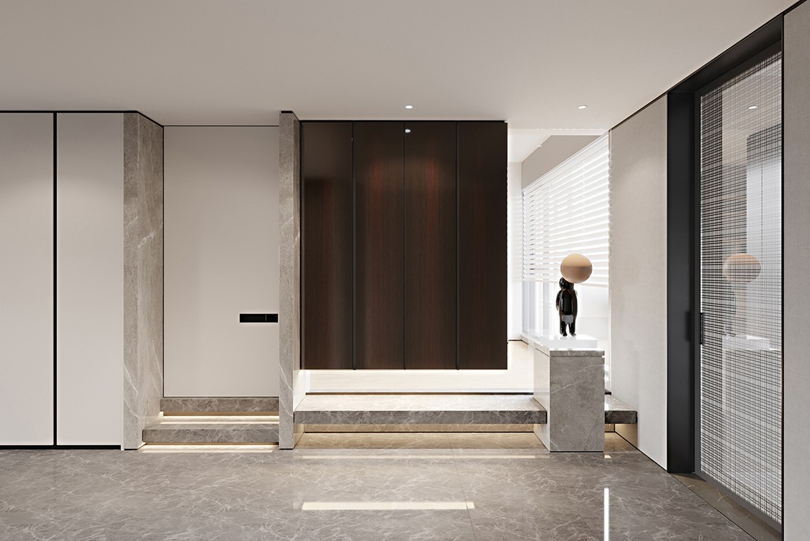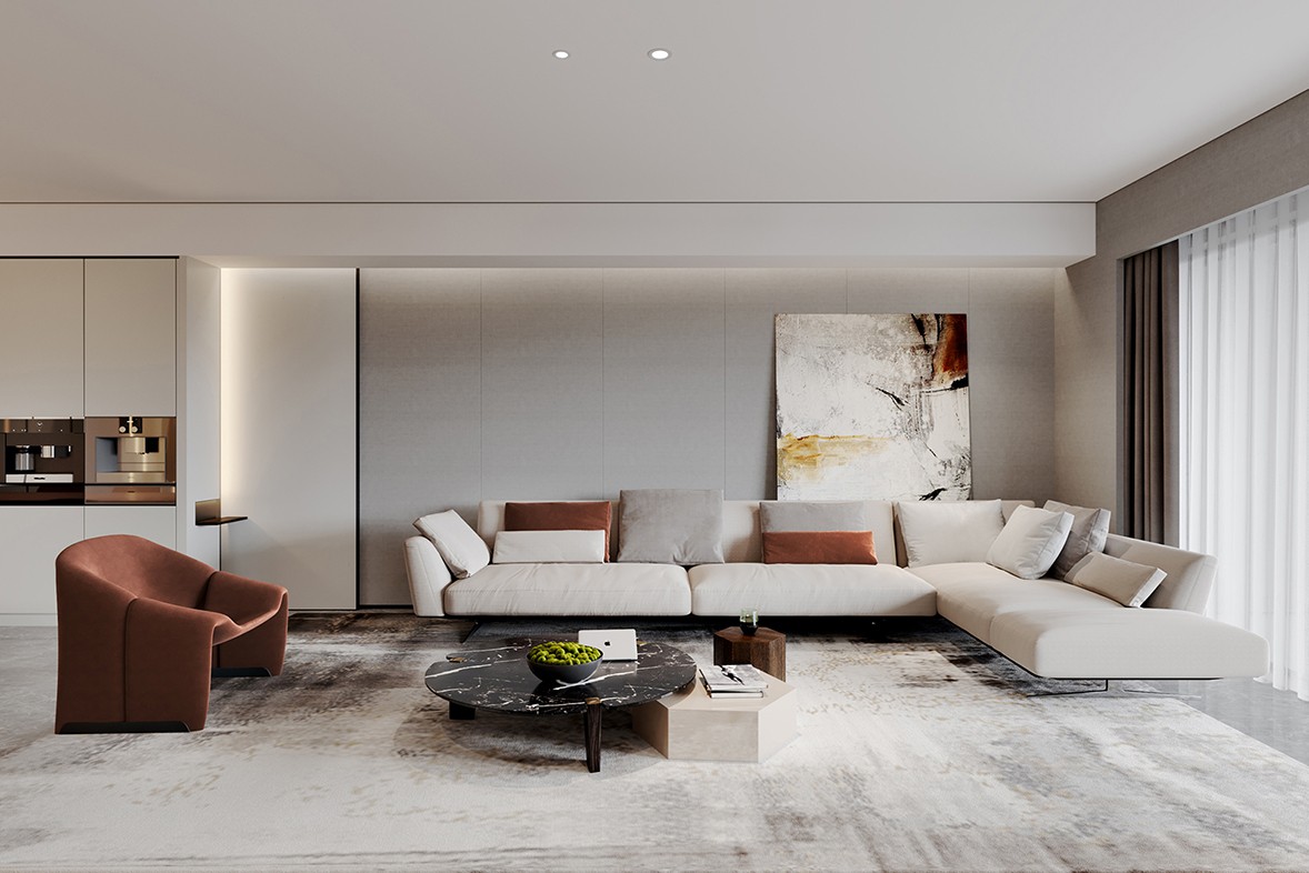 The wooden-textured entrance hall cabinets are equipped with exquisite decorations, music and line elements, and there is an indescribable agility in the elegance and simplicity. Walking into this modern art-style space, you can get extraordinary enjoyment visually in an instant. To simplify, simple and beautiful, the ultimate beauty. The living room without the main lamp design is more transparent and bright visually, and the sun shines through the window screens, warm and bright. The wooden elements make the space softer and warmer, the green plants bring a natural and lively atmosphere, and the color-blocking carpet harmonizes the overall color.