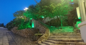 度假村園區(qū)局部亮化工程,采用綠色和暖色照樹燈從下晚上照亮樹木的同時(shí)打出美麗的光影效果,樓梯采用大功率暖色投影燈照射,施工出現(xiàn)效果期待整體完美效果。